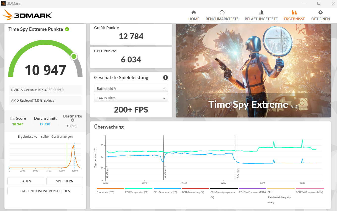 Der Benchmark zeigt aber, dass der GPU Undervolt hervorragend funktioniert hat. Die Temperaturen sd dauerhaft unter 50 Grad und dass, obwohl ich die Lüfterkurve sehr aggressiv auf Lautstärke optimiert habe. Während des Benchmarks und im Gaming-Betrieb ist nur die Wasserpumpe etwas zu hören, der Rest quasi nicht.